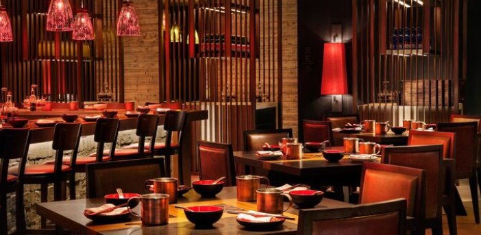 Restoran yang digambarkan dalam gambar ini menampilkan desain interior yang kaya dan mengundang, yang dengan jelas mengadopsi estetika Asia kontemporer, sering kali ditemukan di kota-kota besar di seluruh dunia, termasuk Jakarta dan Macau. Suasana didominasi oleh perpaduan elemen kayu berwarna gelap dan pencahayaan hangat, menciptakan ruang makan yang terasa intim namun mewah. Penggunaan warna merah yang menonjol, baik pada mangkuk saji maupun aksen pencahayaan, menambah kesan dinamis dan energi, ciri khas yang sering dikaitkan dengan keramahan dan keberuntungan dalam budaya Asia.
